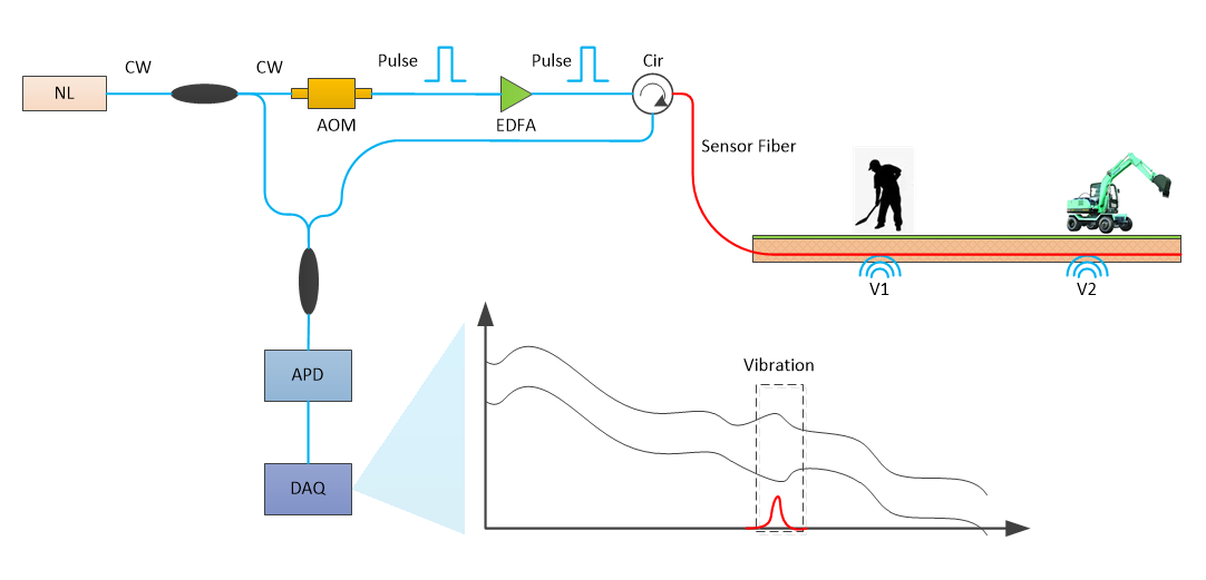 分布式光纖振動(dòng)傳感系統(tǒng)( Distributed Optical Fiber Vibration Sensing System, DVS)是以光纖作為傳感器進(jìn)行振動(dòng)感知的光學(xué)儀器,該系統(tǒng)利用單根光纖同時(shí)實(shí)現(xiàn)振動(dòng)的監(jiān)測(cè)和信號(hào)的傳輸。