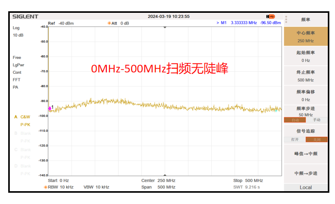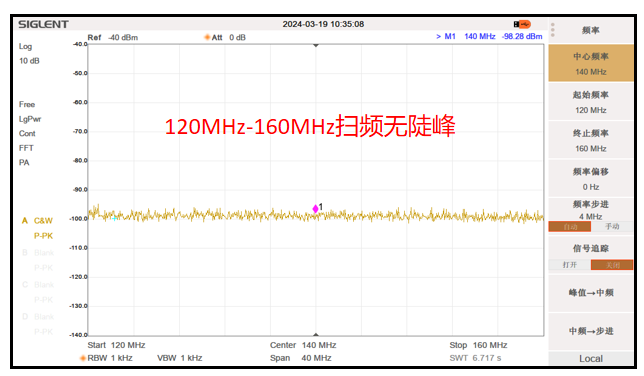 平衡光電探測器掃頻測試,0-500M掃頻無陡峰,120MHz-160MHz掃頻無陡峰。
