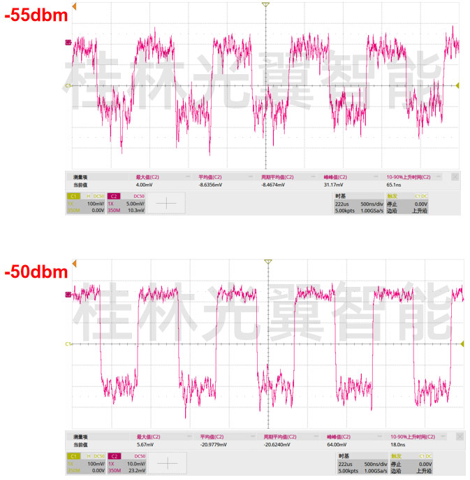 我們測試1M頻率(1M方波)方案,平均光功率-58dbm,-55dbm,-50dbm,示波器效果如下。