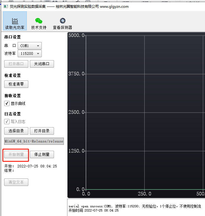 以上步驟準(zhǔn)備就緒,我們就可以開(kāi)始采集熒光功率數(shù)據(jù)了,在采集軟件上點(diǎn)擊“開(kāi)始測(cè)量”按鈕,然后在右側(cè)的即可看到當(dāng)前熒光的功率數(shù)據(jù)。