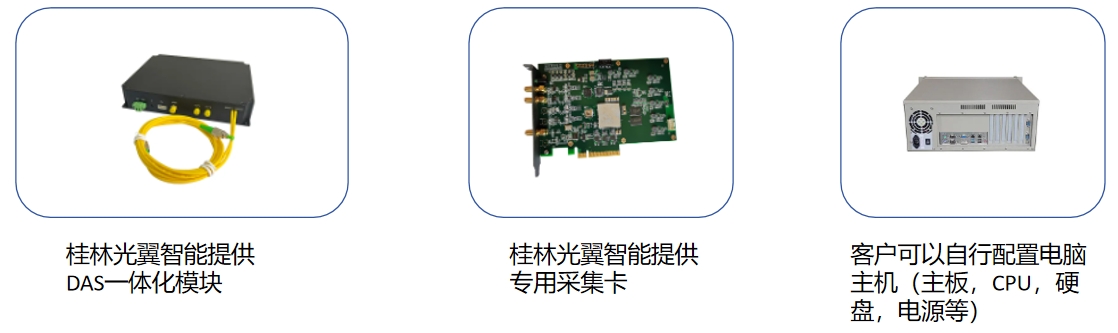 DVS/DAS的硬件產(chǎn)品為3部分,1.DVS/DAS一體化模塊,2.專用采集卡,3.電腦主機(jī)。DVS/DAS一體化模塊產(chǎn)品內(nèi)部已經(jīng)集成探測需要的所有器件(包括激光器,AOM,EDFA,BPD和必要的光器件,輸出電信號);采集卡是為DVS/DAS應(yīng)用量身定制的,不是通用采集卡,內(nèi)置了需要的算法;電腦主機(jī)用于讀取采集卡采集到的數(shù)據(jù),并進(jìn)行后續(xù)的信息處理及軟件呈現(xiàn)。我們也可以幫客戶把這部分全部集成好,那交付的就是我們硬件一體機(jī)產(chǎn)品。
