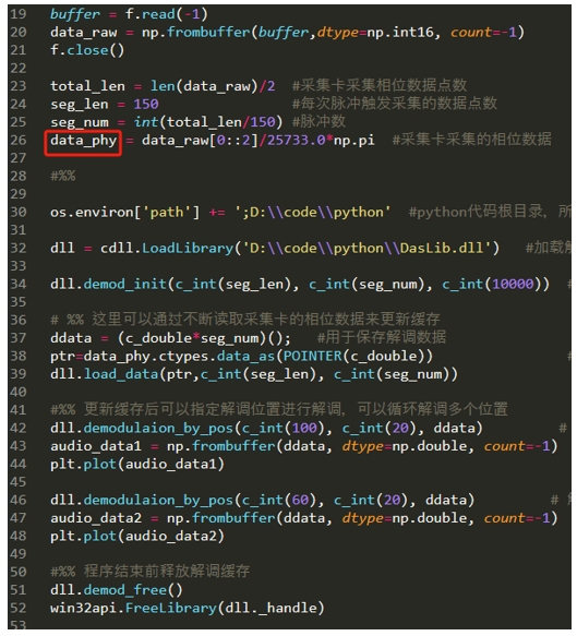 如果您做DAS,通過采集卡您可以獲取到IQ解調(diào)后的幅度和相位數(shù)據(jù),但這還不是最終的振動(dòng)數(shù)據(jù)(還不能當(dāng)聲音播放),最終音頻數(shù)據(jù)還需要進(jìn)行解調(diào)才能獲取。您可以選擇自行解調(diào),也可以選擇通過我們的付費(fèi)解調(diào)庫(也是DLL的動(dòng)態(tài)鏈接庫)進(jìn)行解調(diào)。